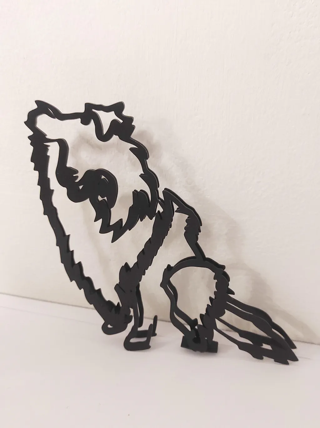Minimalist metal Rough Collie dog statue sculpture. Made in slight abstract style, this sculpture is the perfect gift to put on the desk of a Collie owner. Can be free standing, but comes with a small strong adhesive pad for a permanent fix.